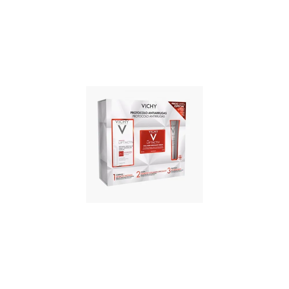 El Cofre Vichy Liftactiv Retinol Serum + Crema Collagen Specialist + UV Age Daily es un set de tratamiento anti-edad de alta eficacia para el cuidado de la piel.